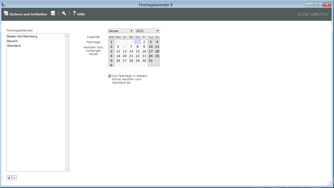 Sie definieren zunächst einen Standard-Feiertagskalender mit den Feiertagen, die global gültig sind, z.B. die Weihnachts-, Ostern- und Pfingstfeiertage. Die Feiertage, die spezifisch für ein Bundesland gültig sind, z.B. Heilige Drei Könige und Fronleichnam, legen Sie dann in abweichenden Feiertagskalendern an.