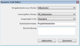 Darüber hinaus ist es mit Hilfe des Dynamik-Link Editors möglich, eine Liste des Moduls „Projektmitarbeiter“ auf einer Registerkarte in der Eingabemaske eines anderen Moduls darzustellen.