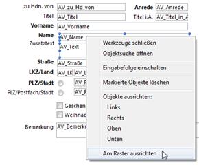 Sie können ein einzelnes oder mehrere Objekte an dem eingestellten Raster ausrichten lassen. Markieren Sie die betreffenden Objekte, klicken Sie mit der rechten Maustaste (Strg + Maustaste bei Ein-Tasten-Maus) auf eines der Objekte und wählen Sie aus dem Kontextmenü den Punkt „Am Raster ausrichten“.