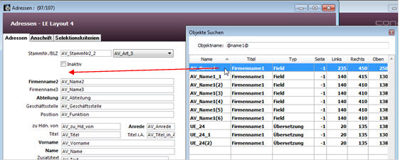 Suchen Sie in dem Fenster „Objekte suchen“ das benötigte Objekt heraus und ziehen es auf das Eingabelayout.