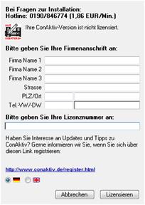 Bestätigen Sie die Meldung. Es erscheint das Lizensierungsfenster.