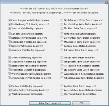 Als nächstes öffnet sich eine Maske, in der Sie auswählen können, welche Daten aus dem aktuellen Mandanten in den neuen Mandanten kopiert werden sollen.