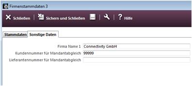 - Der Ausgangsmandant muss im Zielmandant als Kunde im Modul „Kunden“ angelegt sein. Darüber hinaus muss die Kundennummer im Zielmandanten in den Firmenstammdaten der Systemparameter (Registerkarte „Sonstige Daten“, Feld „Kundennummer für Mandantenabgleich“) hinterlegt werden.