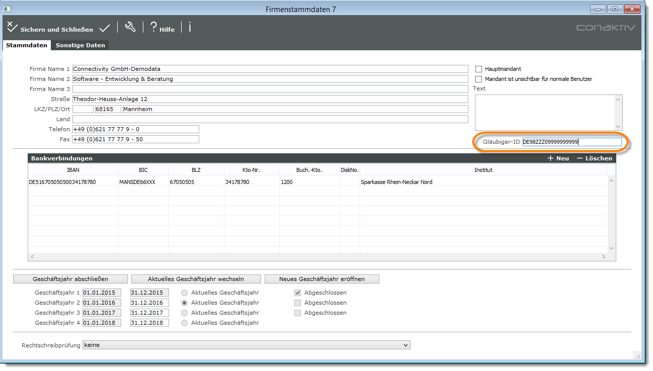 In ConAktiv® hinterlegen Sie die Gläubiger ID in den Firmenstammdaten der Systemparameter.