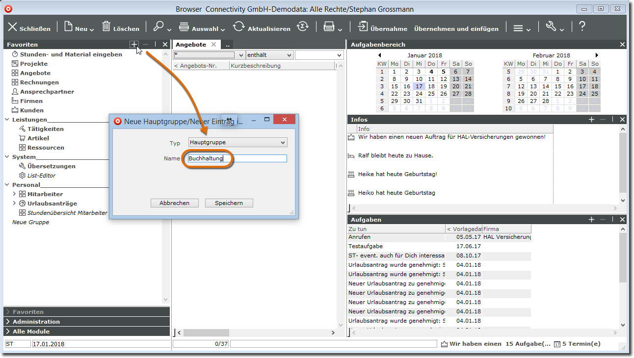 Im Browser können Sie sich eigene Hauptgruppen definieren, mit denen Sie Module, Suchen, Auswertungen, Funktionen und Ansichten, z.B. nach Geschäftsbereichen gruppieren können.