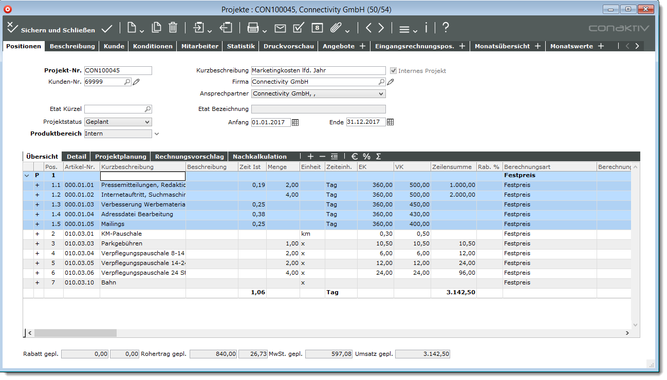 Möchten Sie innerhalb der Positionsliste mehrere aufeinander folgende Einzelpositionen zu einem Leistungspaket zusammenzufassen, dann markieren Sie die gewünschten Positionen in der Positionsliste und klicken mit der rechten Maustaste (FFA) auf die Markierung und wählen Sie die Funktion „Zusammenfassen“ aus.
