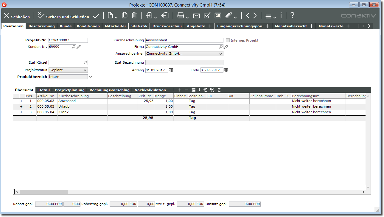 Fügen Sie in die Positionsliste des Projekts die Tätigkeiten ein, die mit den Restzeiten der Anwesenheit und den Sonderzeiten bebucht werden sollen.