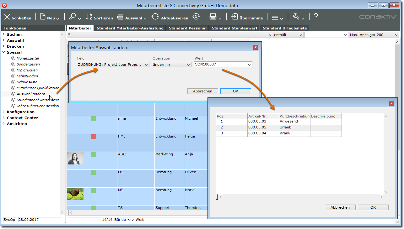 Haben Sie die Anwesenheitsposition gewählt, dann klicken Sie in dem Dialog auf den Knopf „OK“. Die Zuordnung des Anwesenheitsprojekts und der –position zu den markierten Mitarbeitern erfolgt.