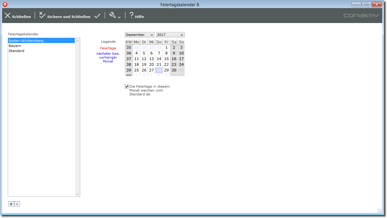 Sie definieren zunächst einen Standard-Feiertagskalender mit den Feiertagen, die global gültig sind, z.B. die Weihnachts-, Ostern- und Pfingstfeiertage. Die Feiertage, die spezifisch für ein Bundesland gültig sind, z.B. Heilige Drei Könige und Fronleichnam, legen Sie dann in abweichenden Feiertagskalendern an.