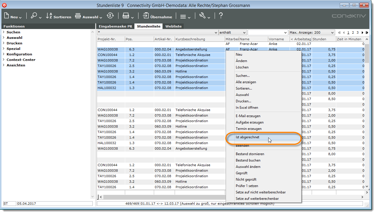 Die markierten Stunden werden als abgerechnet gekennzeichnet, d.h., das Ankreuzfeld „Ist abgerechnet“ wird bei den betreffenden Datensätzen aktiviert.
