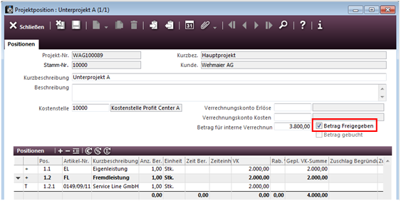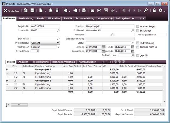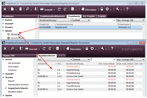 Der Projektleiter öffnet hierzu die Projektliste und sucht sich das Hauptprojekt heraus. Dann ruft er die Positionsliste auf, in der die im Projekt erfassten Unterprojekte und deren Leistungen angezeigt werden.