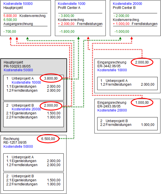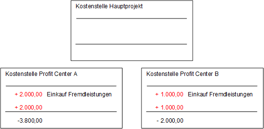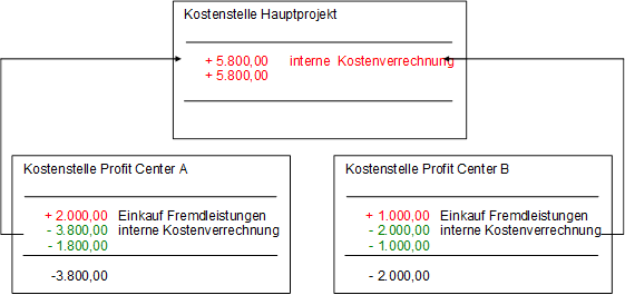 Die Kostenstelle des Hauptprojekts wird durch die Verbuchung mit einem Betrag von 5.800,- belastet. Die Kostenstelle des Unterprojekts A wird mit einem Betrag von 3.800,- und die Kostenstelle des Unterprojekts B mit einem Betrag von 2.000,- entlastet.