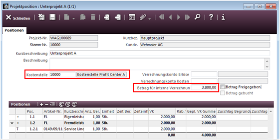 Danach werden die Unterprojekte verbucht, sodass die entsprechenden Verrechnungsbeträge auf die angegebenen Kostenstellen laufen.