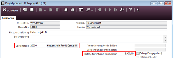 Nachdem die Projektarbeiten durchgeführt sind, kalkuliert der Projektleiter des Unterprojekts A die Gesamtkosten des Unterprojektes und erfasst diese Kosten zur internen Verrechnung im Unterprojekt. Dieser Betrag entlastet später bei Verbuchung des Unterprojekts die Kostenstelle des Profit Centers und belastet die Kostenstelle des Hauptprojekts.