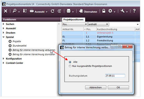 In der Positionsliste markiert er alle Positionen und führt aus dem Spezialmenü der Bedienleiste die Funktion „Betrag für interne Verrechnung verbuchen“ für die ausgewählten Projektpositionen aus.