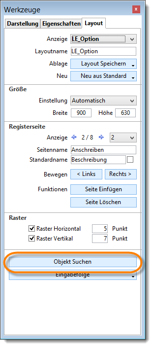 Diese Funktion dient der Suche von Objekten, die Sie auf eine Registerkarte einfügen möchten. Klicken Sie auf den Knopf „Objekt Suchen“, so öffnet sich das folgende Fenster: