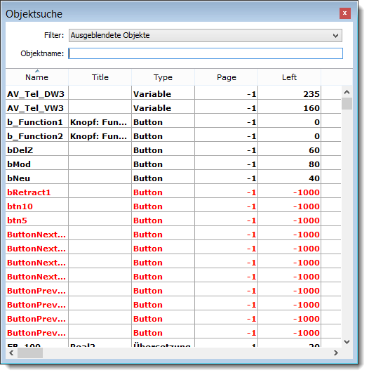 Objekte, die im Eingabelayout sichtbar sind, werden in der Liste in schwarzer Normalschrift angezeigt. Ausgeblendete Objekte, die sich aber noch auf dem Eingabelayout befinden, werden in schwarzer Fettschrift dargestellt. Ausgeblendete Objekte, die sich nicht auf dem Eingabelayout befinden, erscheinen in roter Schrift.