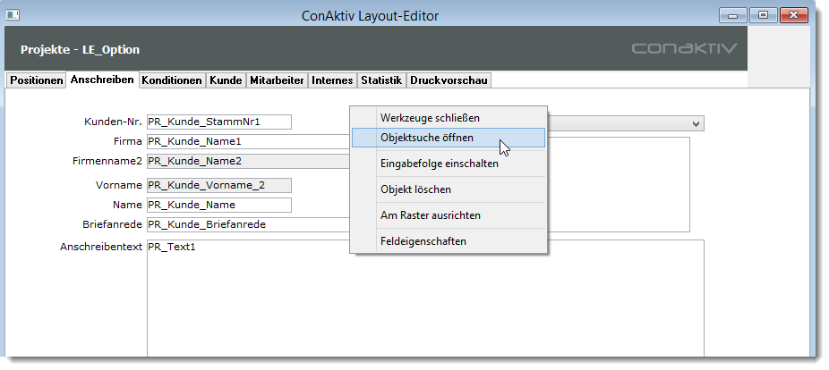 Alternativ können Sie das Fenster „Objekte Suchen“ auch über das Kontext-Menü (Klick mit der rechten Maustaste) öffnen, wenn Sie den Menüpunkt „Objektsuche öffnen“ auswählen.