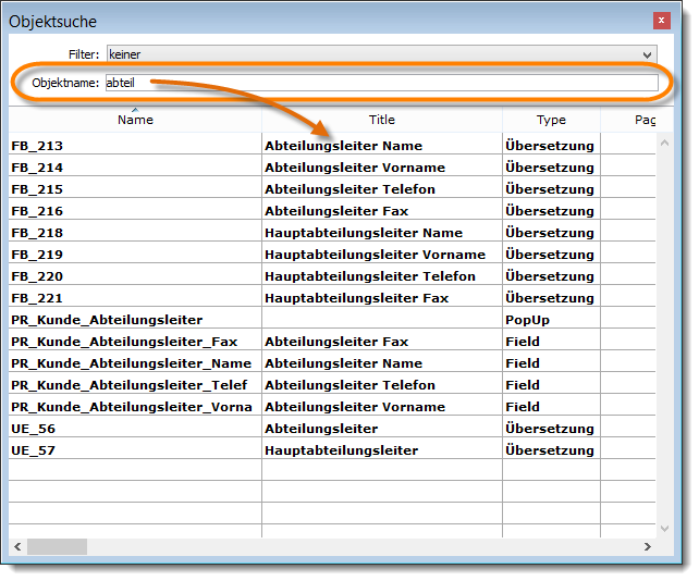 In dem Fenster „Objekte suchen“ können Sie über das Feld „Objektname“ ein Objekt anhand dessen Objektnamen suchen.