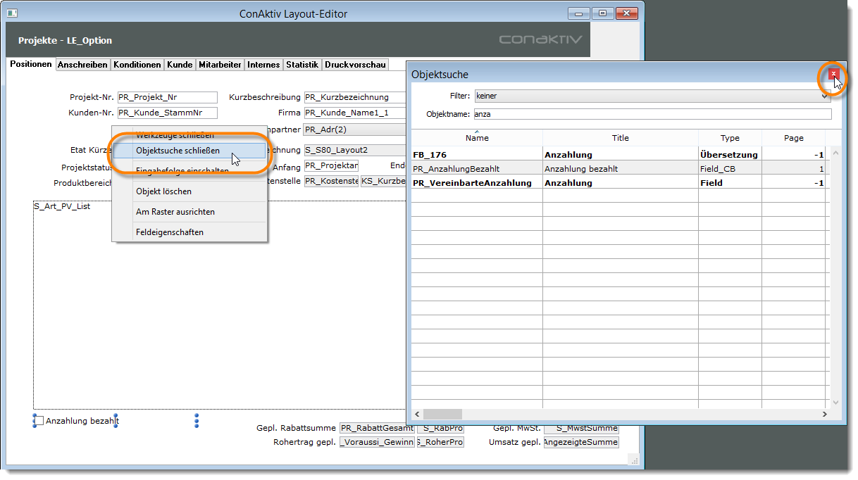 Sie können das Fenster „Objekte Suchen“ entweder über das Schließkreuz schließen oder über das Kontext-Menü (Klick mit der rechten Maustaste), wenn Sie den Menüpunkt „Objektsuche schließen“ auswählen.