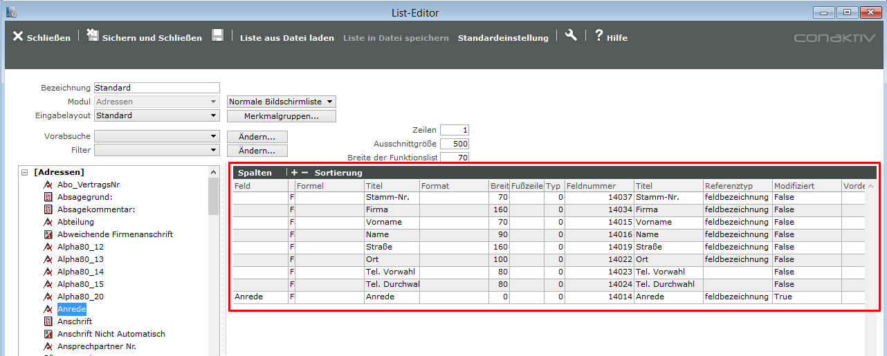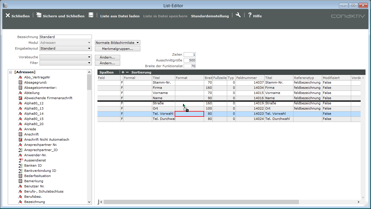 Im Bereich „Spalten” stellt jeder Eintrag eine Spalte der Bildschirmliste dar. Die Reihenfolge der Einträge von oben nach unten entspricht der Spaltenreihenfolge von links nach rechts. So ist der oberste Eintrag in dem Bereich „Spalten” die erste Spalte in der Bildschirmliste.