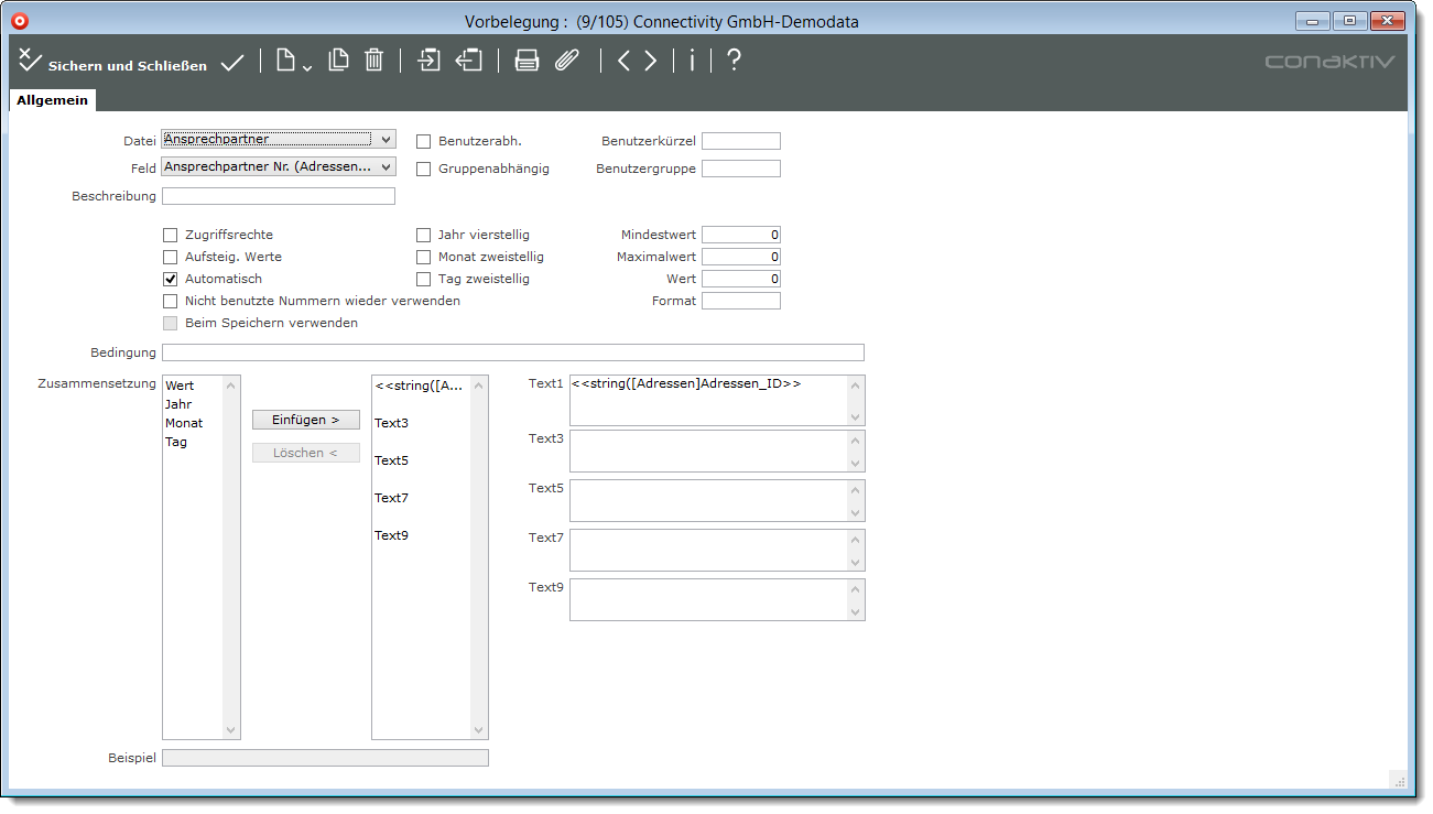 Dieses Feld muss mit einer eindeutigen Nummer versehen werden. Diese eindeutige Nummer muss bei Ansprechpartnerneuanlage über eine Vorbelegung erzeugt werden.