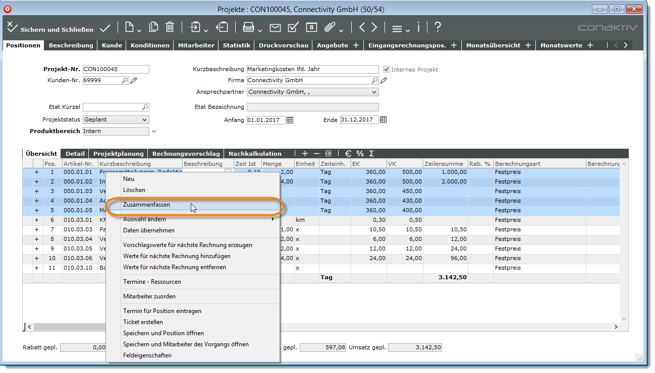 Möchten Sie innerhalb der Positionsliste mehrere aufeinander folgende Einzelpositionen zu einem Leistungspaket zusammenzufassen, dann markieren Sie die gewünschten Positionen in der Positionsliste und klicken mit der rechten Maustaste (FFA) auf die Markierung und wählen Sie die Funktion „Zusammenfassen“ aus.