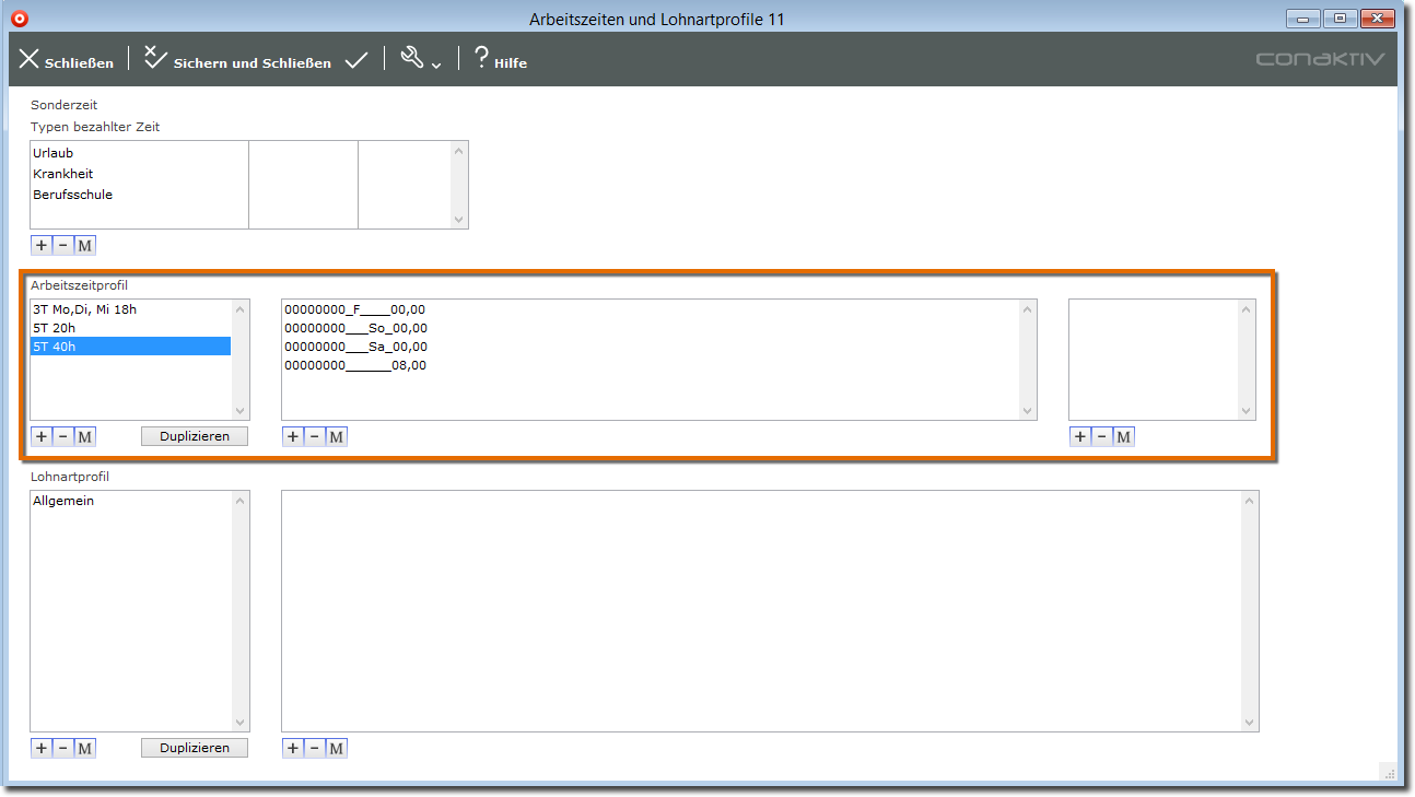 Ein Arbeitszeitprofil wird im Modul „Systemparameter“ unter Arbeitszeiten und Lohnartprofile im Bereich „Arbeitszeitprofil“ erstellt und einem Mitarbeiter in dessen Mitarbeiterdatensatz zugeordnet.
