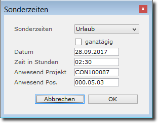 Ist das Ankreuzfeld „ganztägig“ deaktiviert, können Sie die Dauer der Sonderzeiten in den Feldern „Datum“ und „Zeit in Stunden“ angeben. Die Stundenanzahl können Sie entweder als Dezimalzahl eingeben, z.B. 2,5 Stunden oder im Format HH:MM, z.B. 02:30, sofern die allgemeine Einstellung „Standardzeit für die Eingabe ist die Minute" für das Modul „Stunden- und Material eingeben“ aktiviert ist.