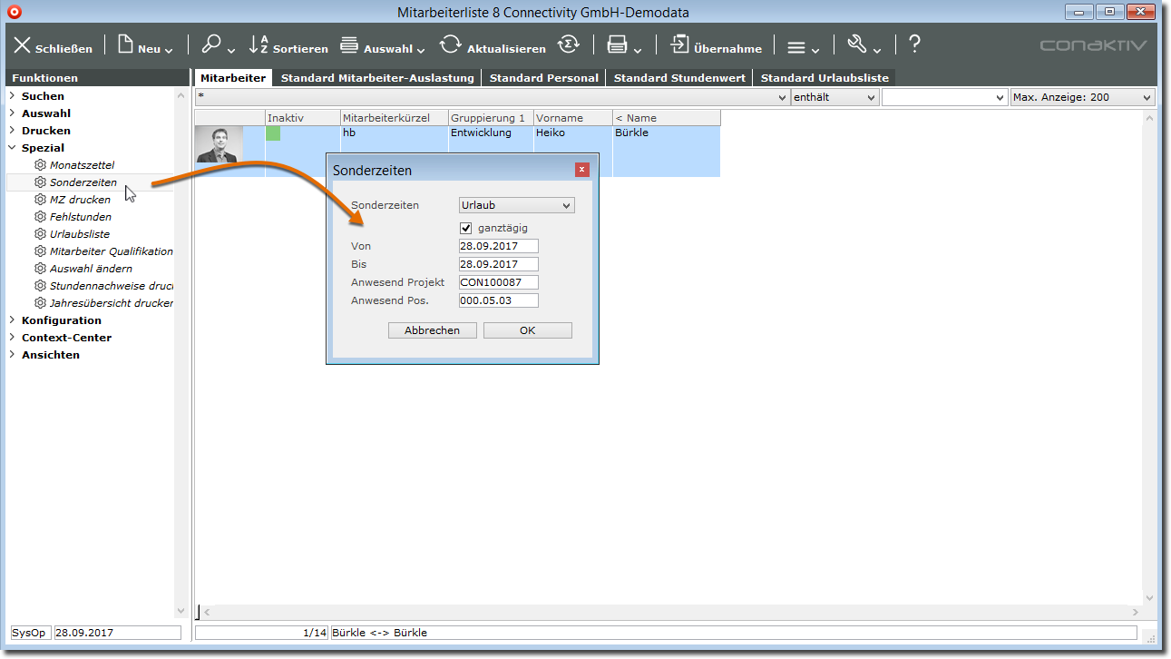 In dem PopUp-Menü „Sonderzeiten“ werden die von Ihnen definierten Sonderzeiten zur Auswahl angeboten. Wählen Sie hier die gewünschte Sonderzeit aus, die Sie dem Mitarbeiter zuordnen möchten.