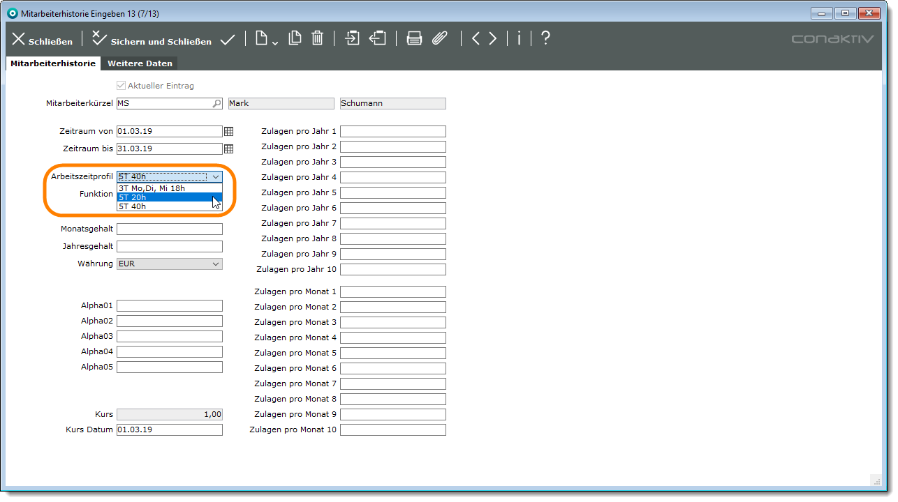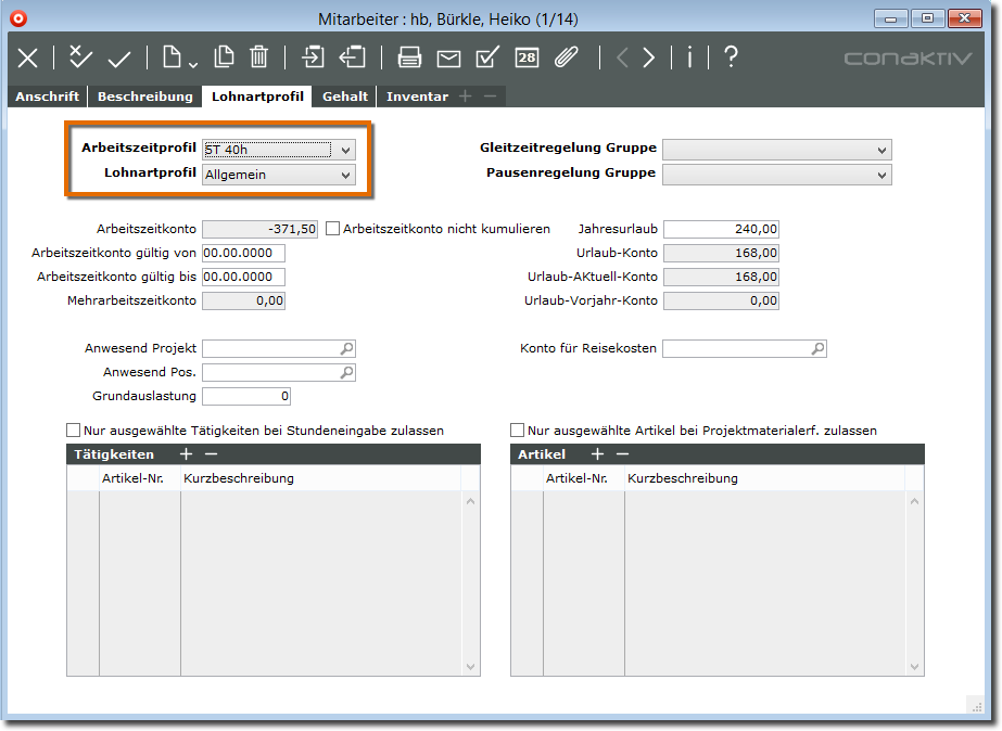 Welches Arbeitszeit- und Lohartprofil für einen Mitarbeiter gelten sollen, legen Sie im Modul „ Mitarbeiter “ fest bzw. in den Historieneinträgen zum Mitarbeiter im Modul „ Mitarbeiterhistorie “.