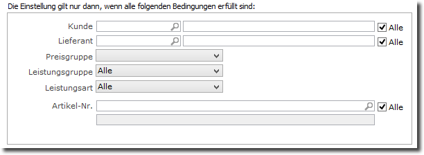 Sie können an dieser Stelle ein oder auch mehrere Kriterien auswählen. Der betreffende Rabatt/Zuschlag wird ausschließlich dann angewandt, wenn alle der angegebenen Kriterien zutreffen.
