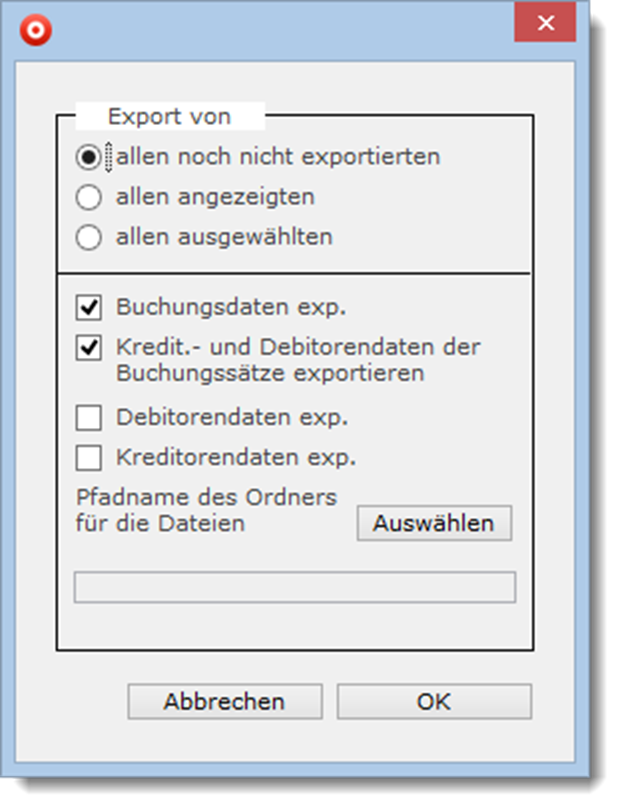 Starten Sie das Modul „Buchungssätze“, so gelangen Sie in die Bildschirmliste des Moduls. Führen Sie aus dem Menü „Spezial“ der Bedienleiste die Funktion „Lexware“ aus, so öffnet sich ein Dialog, in welchem Sie festlegen können, welche Buchhaltungsdaten exportiert werden sollen.