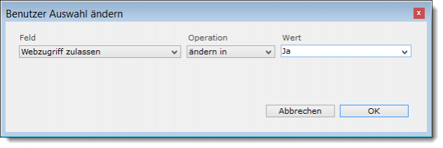 Mit Hilfe der Funktion „Auswahl ändern“ können Sie für eine Auswahl von Benutzern für ein bestimmtes Feld den gleichen Feldinhalt zuordnen bzw. einen Feldinhalt komplett oder teilweise ersetzen. Nehmen wir an, Sie möchten in einer Auswahl von Benutzern die Domäne für das Windows-Login ändern. Sie müssen nun nicht jeden Datensatz einzeln öffnen und die Änderung vornehmen, sondern können dies mit Hilfe der Funktion „Auswahl ändern“ mit ein paar wenigen Angaben erledigen.