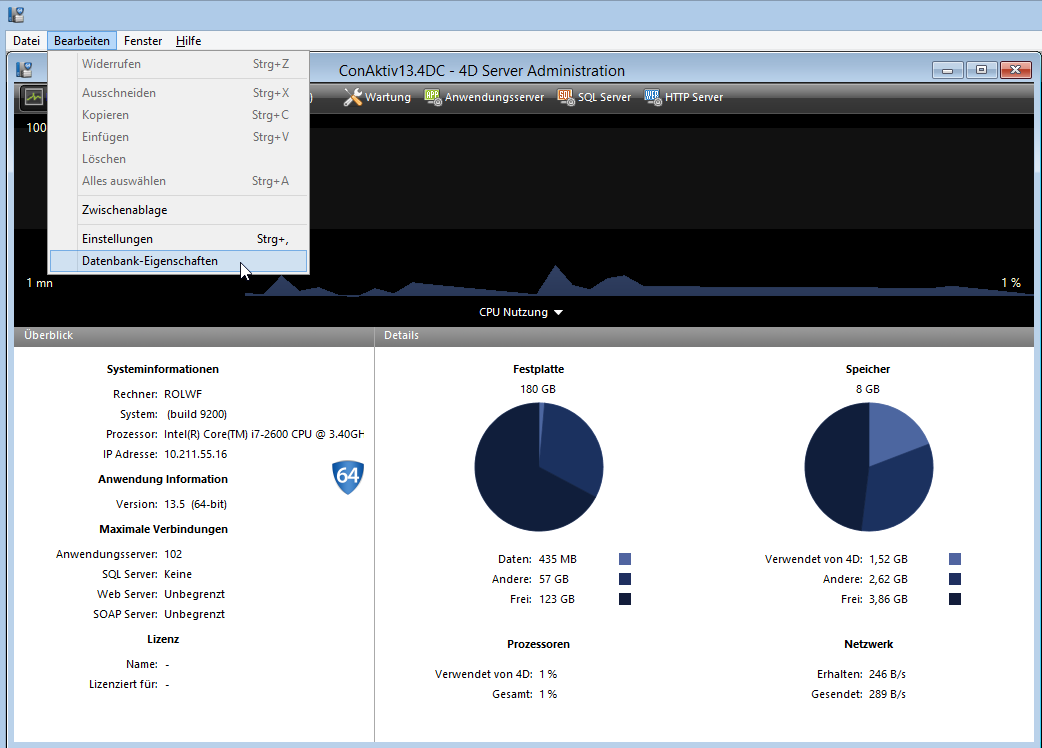 Um den ConAktiv®-Server für den Zugriff über ConAktiv® Mobile zu konfigurieren, öffnen Sie am Server unter dem Bearbeiten-Menü die Datenbank-Eigenschaften.