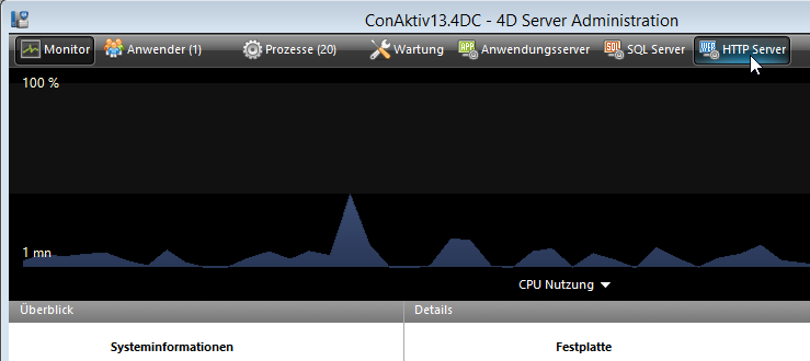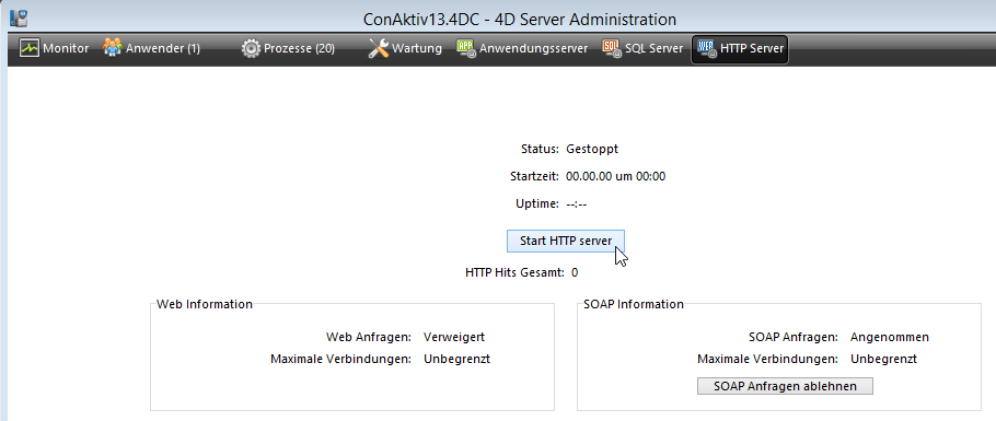 Sofern Sie nicht die Option „Web Server automatisch starten“ aktiviert haben, müssen Sie den Web-Server manuell starten. Klicken Sie hierzu auf dem Administrationsfenster des ConAktiv® Servers auf den Knopf „HTTP Server“.