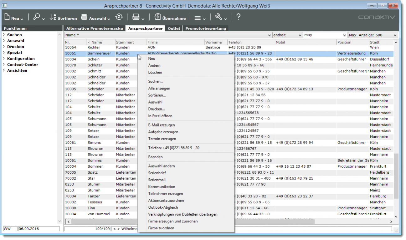 Wird der FFA konkret auf einen oder mehrere Datensätze angewandt, so werden neben den oben aufgeführten Funktionen noch weitere zur Auswahl angeboten, die u.a. die Datensätze direkt betreffen. Diese Funktionen sind „Ändern“, „Löschen“, „Auswahl“, „Drucken…“ (Print-Center), „E-Mail erzeugen“, „Aufgabe erzeugen“, „Termin erzeugen“ und am Beispiel eines Datensatzes aus dem Modul „Ansprechpartner“ das Wählen der dort hinterlegten Telefonnummer (bei installierter TAPI-Schnittstelle), das Zuordnen von Ansprechpartnern zu einer Privatkategorie und das Entfernen von Ansprechpartnern aus einer Privatkategorie.