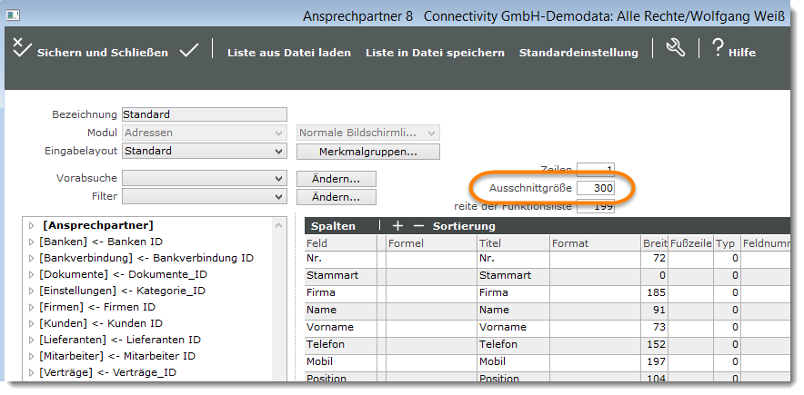 Geben Sie hier die gewünschte Anzahl ein und klicken Sie auf den Knopf „OK“. Der Wert wird übernommen und die Anzeige der Datensätze pro Listenseite entsprechend erweitert bzw. vermindert.