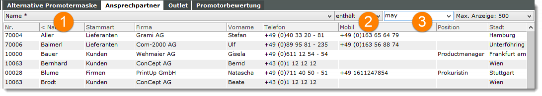 Oberhalb der Spaltenköpfe einer Bildschirmliste finden Sie die Schnellsuche von ConAktiv®.