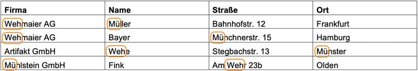 Ist der * als Suchfeld eingestellt, dann können Sie auch nach mehreren Kriterien gleichzeitig suchen. Geben Sie die einzelnen Suchkriterien einfach durch Leerzeichen getrennt in das Feld „Suchkriterien“ ein, z.B. „Weh Mü“, und bestätigen Sie die Suche. Es wird in allen indizierten Feldern nach den beiden Kriterien gesucht. Die Datensätze, bei denen die Kriterien gefundenen werden, werden in das Suchergebnis übernommen.