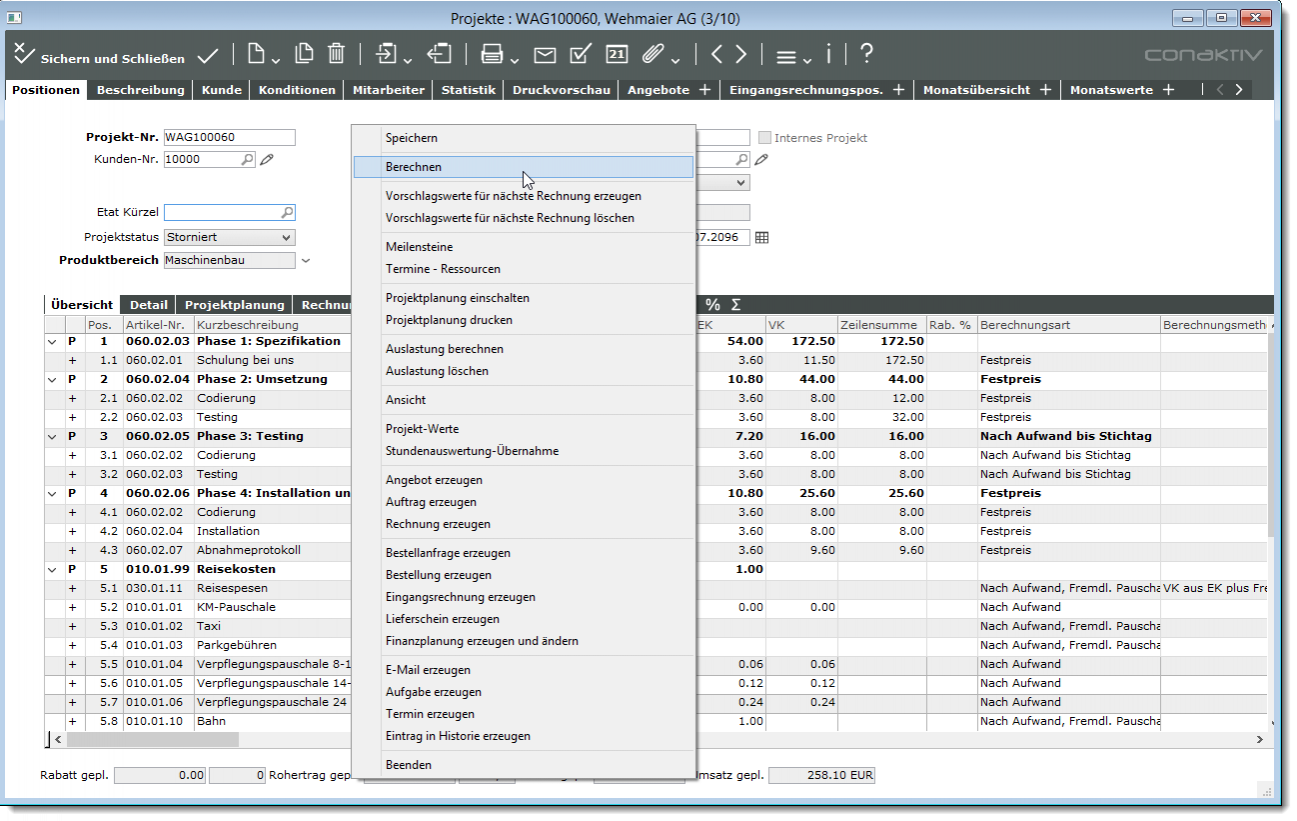 Klicken Sie in einer Eingabemaske mit der rechten Maustaste (Windows) bzw. mit der Befehlstaste in Kombination mit der Maustaste (MacOS) in einen bestimmten Bereich der Maske oder konkret auf ein Feld, so werden in einem Menü die Funktionen angezeigt, die Sie im entsprechenden Kontext anwenden können. Diese Art des Funktionsaufrufs wird in ConAktiv® als Fast Function Access (FFA) bezeichnet.
