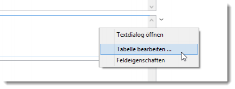 Wurde an das Feld bereits eine Tabelle angebunden, so wird die Funktion zur Bearbeitung der Tabelle zur Auswahl angeboten.