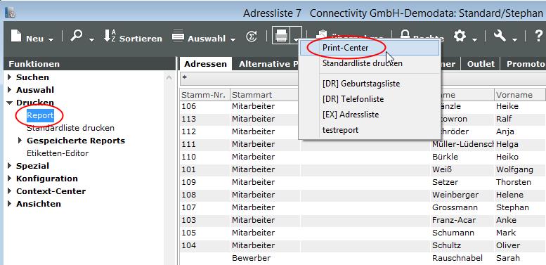 Mit dem Report-Editor erstellen Sie Reports aus einer Bildschirmliste von ConAktiv® heraus. Zum Erstellen einer neuen Reportvorlage gehen Sie folgendermaßen vor: Öffnen Sie die Bildschirmliste des entsprechenden Moduls. Rufen Sie in der Bildschirmliste entweder unter dem Drucken-Menü der Bedienleiste die Funktion „Report“ bzw. unter dem Drucken-Menü in der Toolbar der Bildschirmliste den Punkt „Print-Center“ auf.