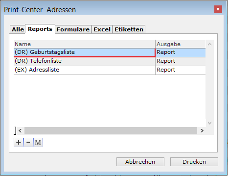 Wechseln Sie, falls nicht schon angezeigt, auf das Register „Reports“. Auf diesem Register werden, sofern vorhanden, die für das entsprechende Modul erstellten und dem betreffenden Benutzer zugeordneten Reports aufgelistet. Klicken Sie auf den Knopf „+“, um eine neue Reportvorlage zu erstellen.