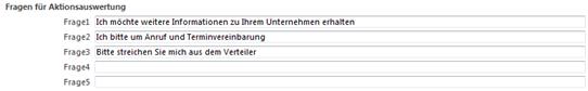 Die Felder „Frage1-5“ können Sie zur Auswertung der Reaktionen auf die Aktion benutzen. Eine Reaktion auf eine Aktion kann beispielsweise der Rückläufer einer Mailingaktion sein.