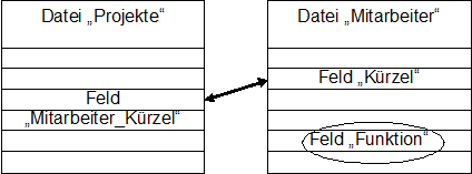 In einzelnen Fällen möchten Sie bei der Gestaltung von Formularen auf Daten zugreifen, die im Formular (bzw. in der betreffenden Datei) nicht direkt zur Verfügung stehen. Möchten Sie beispielsweise bei einer Projektauswertung den Namen sowie die Funktion des Projektleiters für das entsprechende Projekt ausdrucken, so haben Sie im Formular für das Modul „Projekte“ auf das Feld „Funktion“ – ein Feld des Moduls „Mitarbeiter“ - keinen Zugriff. Der Pfad von der Datei, die Sie im Formular bearbeiten, zu dem gewünschten Feld einer anderen Datei muss mit Hilfe einer ConAktiv®-Funktion definiert werden. Hierzu müssen zunächst eindeutig korrespondierende Felder zwischen der Datei, für die Sie das Formular erstellen, und der Datei, auf deren Feld Sie zugreifen möchten, gefunden werden. Am Beispiel des Formulars zur Projektauswertung mit Ausdruck der Funktion des Projektleiters kann der Pfad zu dem gewünschten Feld mit Hilfe der Felder „[Projekte]Mitarbeiter_Kürzel“ und „[Mitarbeiter]Kürzel“ gelegt werden.