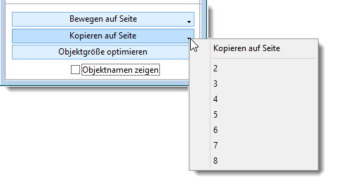 Die Nummern in dem Menü repräsentieren die Registerkarten entsprechend der angezeigten Reihenfolge im Eingabelayout. Klicken Sie auf den gewünschten Eintrag, um das Objekt auf die entsprechende Registerkarte zu kopieren. Die Objekte werden auf der neuen Registerkarte an die gleiche Position kopiert, an der sie sich auf der ursprünglichen Registerkarte befinden.