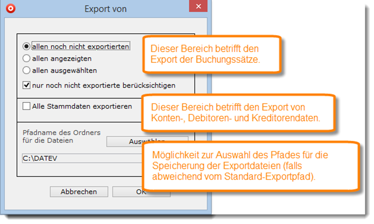 Starten Sie das Modul „Buchungssätze“, so gelangen Sie in die Bildschirmliste des Moduls. Führen Sie aus dem Menü „Spezial“ der Bedienleiste die Funktion „DATEV“ aus, so öffnet sich ein Dialog, in welchem Sie festlegen können, welche Buchhaltungsdaten exportiert werden sollen.