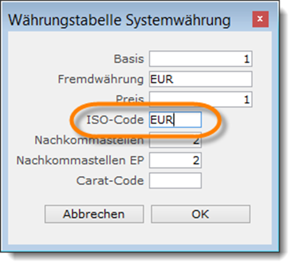 Tragen Sie dort in das Feld „ISO-Code“ den für die betreffende Währung gültigen ISO-Code ein. Diese Codes sind beispielsweise: