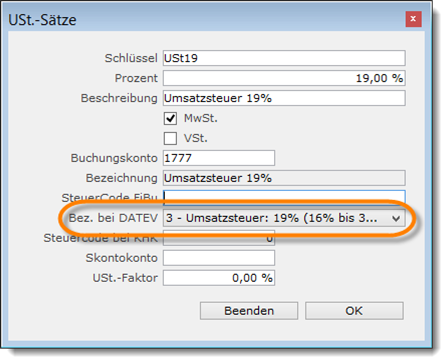 Da die Lexware-Umsatzsteuerkennzeichen denen von DATEV entsprechen, werden diese auch im PopUp-Menü „Bez. bei DATEV“ hinterlegt. Klicken Sie auf das PopUp-Menü, so können Sie aus der angezeigten Liste die zu dem Steuerschlüssel passende Bezeichnung bei Lexware auswählen.